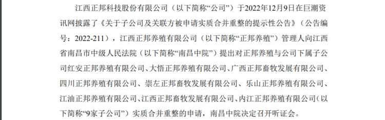 根据正邦科技12月20日晚间公告,公司于2022年12月9日披露了《关于子公司及关联方被申请实质合并重整的提示性公告》,江西正邦养殖有限公司(以下简称“正邦养殖”)管理人向江西省南昌市中级人民法院(以下简称“南昌中院”)提出对正邦养殖与公司下属子公司红安正邦养殖有限公司、大悟正邦养殖有限公司、广西正邦畜牧发展有限公司、四川正邦养殖有限公司、崇左正邦畜牧发展有限公司、乐山正邦养殖有限公司、江油正邦养殖有限公司、江西正邦畜牧发展有限公司、内江正邦养殖有限公司(以下简称“9家子公司”)实质合并重整的申请,南昌中院于2022年12月15日召开实质合并重整听证会,申请人、被申请人及部分债权人代表参加了听证。
