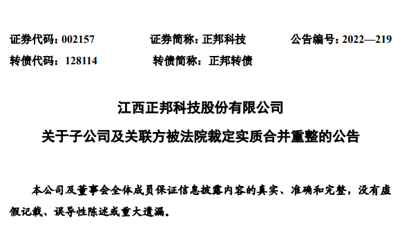 12月7日,正邦养殖管理人向江西省南昌市中级人民法院提交申请,以红安正邦养殖有限公司等9家公司与正邦养殖存在法人人格混同、区分公司之间资金及资产往来成本过高,为保护债权人公平清偿,存在实质合并的可行性和必要性为由,申请将9家公司纳入正邦养殖重整一案并适用实质合并方式进行审理。9家公司分别是:红安正邦养殖有限公司、大悟正邦养殖有限公司、广西正邦畜牧发展有限公司、四川正邦养殖有限公司、崇左正邦畜牧发展有限公司、乐山正邦养殖有限公司、江油正邦养殖有限公司、江西正邦畜牧发展有限公司、内江正邦养殖有限公司12月20日,正邦养殖管理人收到法院裁定书,法院裁定:1、受理9家子公司破产重整;2、对9家子公司与江西正邦养殖有限公司进行实质合并重整。