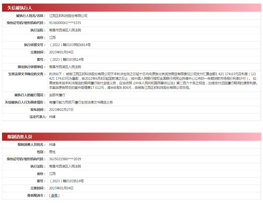 另外,正邦科技法人林峰也被限制消费。