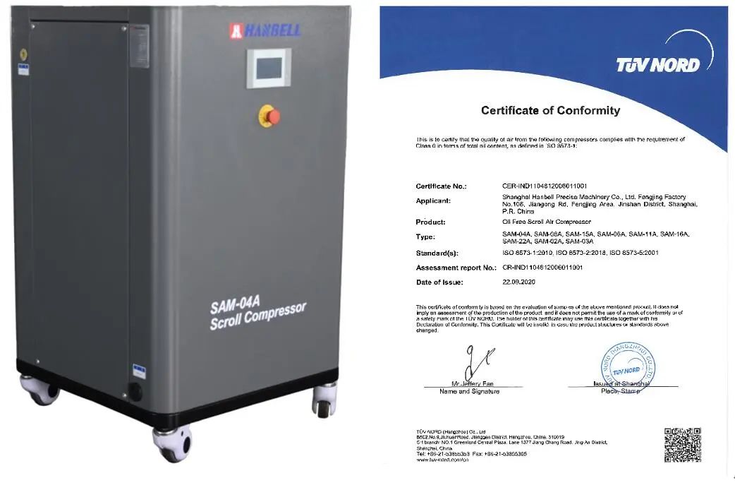 汉钟精机SAM无油涡旋空气压缩机全系机组通过TUV Class 0级无油认证,为用户提供洁净无油的压缩空气。