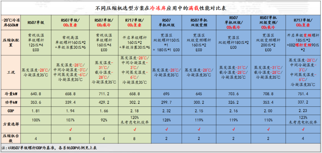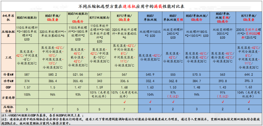 除了上述采用高效节能设备来减少间接碳排放量的方式外,还可以结合使用自然工质来减少系统中氟利昂的充注量,从而减少制冷系统意外泄漏后的造成的直接碳排放量。下表为纯氟系统以及自然工质系统中不同压缩机选型方案在冷冻库、速冻机应用中的对比: