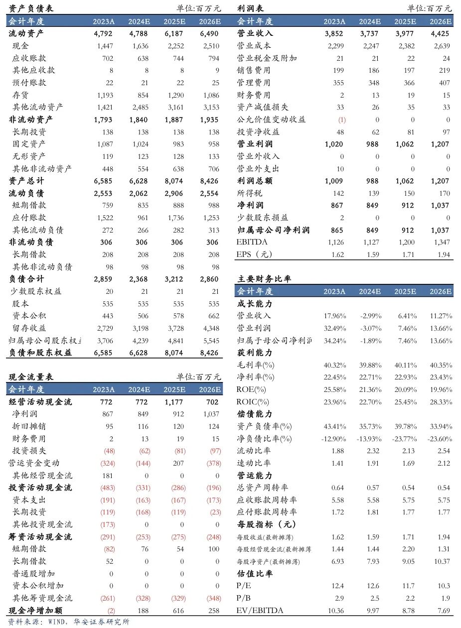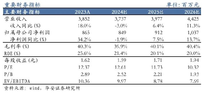 我们看好公司长期发展,但考虑到大环境影响,修改盈利预测为:2024-2026年营业收入预测37.37/39.77/44.25亿元(前值为42.35/48.47/55.80亿元;归母净利润预测为8.49/9.12/10.37亿元(前值为9.69/11.18/13.05亿元);以当前总股本5.35亿股计算的摊薄EPS为1.59/1.71/1.94元(前值为1.81/2.09/2.44元)。当前股价对应的PE倍数为13/12/10倍,维持“买入”投资评级。