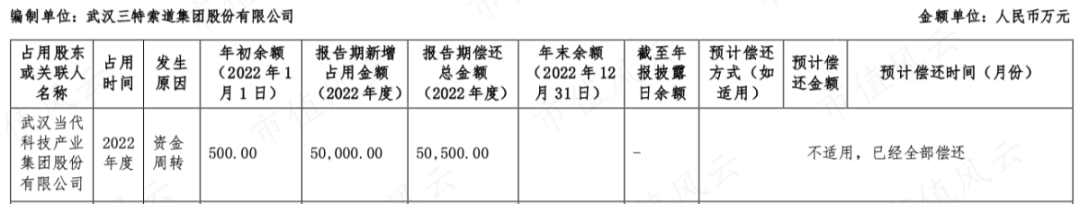 2022年1月1日,当代集团就拿走了三特索道500万资金,2022年期间当代集团再次拿走5个亿,虽然后面5.05亿全还了,但已经构成了性质恶劣的控股股东非经营性占用资金。