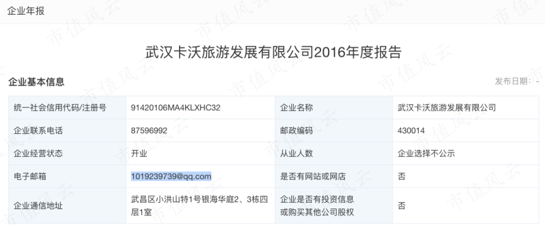 此外,武汉卡沃旅游发展有限公司2016年年报的邮箱是1019239739@qq.com。