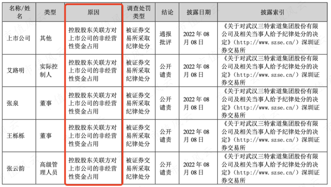 2022年8月8日,深交所于对三特索道,以及实际控制人艾路明、董事长张泉、董事兼总裁王栎栎及公司总会计师张云韵予以公开谴责处分。