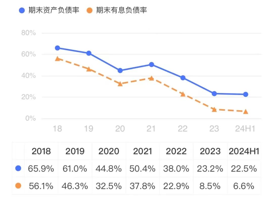 截至今年上半年,公司负债率达到历史低点22.5%,尤其是有息负债率仅为6.6%,较2022年下降16个百分点,今年上半年财务费用也随之下降至47.7万元。