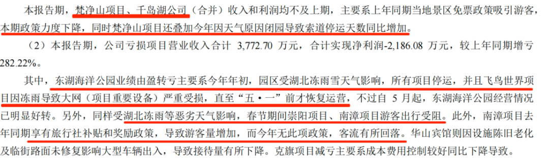 比如亏损项目中东湖海洋公园项目值得关注,今年上半年主要受到湖北的冻雨天气影响该项目净利润亏损近22万,公司称5月起经营情况已明显好转。