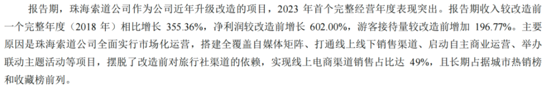 珠海索道是公司近年升级改造项目,表现突出的主因是该项目全面实行市场化运营。公司打通线上线下销售渠道、启动自主商业运营,摆脱了改造前对旅行社渠道的依赖。