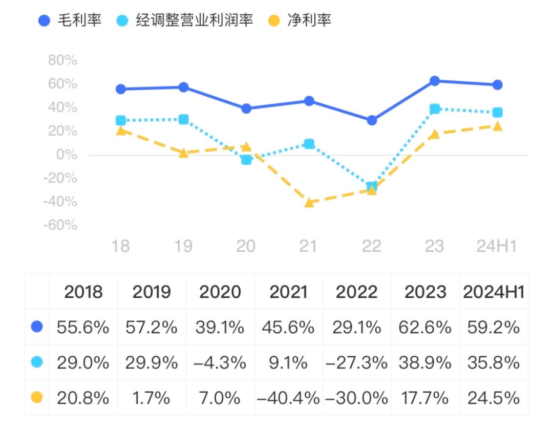 与此同时,公司的综合毛利率出现企稳向好的迹象,2023年以及今年上半年分别为63%、59%,高于疫情前2018年56%的水平。