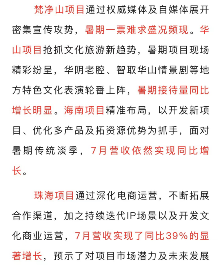 此外,梵净山以及华山项目暑期接待量增长明显,海南项目在暑期传统淡季下7月营收依然实现增长。