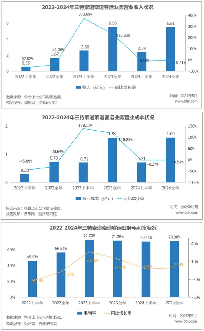 2024年,索道客运业务营业收入为5.51亿元,上年同期为5.55亿元,同比下降0.71%。营业成本为1.60亿元,上年同期为1.59亿元,同比增长0.54%。毛利率70.98%,上年同期为71.35%,同比下降0.36%。