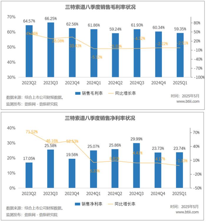 一季度,三特索道销售毛利率59.35%,上年同期为61.86%,同比下降2.51%。销售净利率为23.74%,上年同期为25.07%,同比下降1.33%。