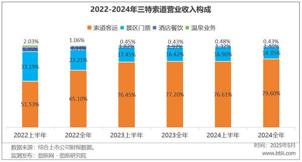 2024年,三特索道营业收入中,索道客运、景区门票、酒店餐饮、温泉业务营业收入占比分别为79.60%、14.35%、1.40%、0.43%。