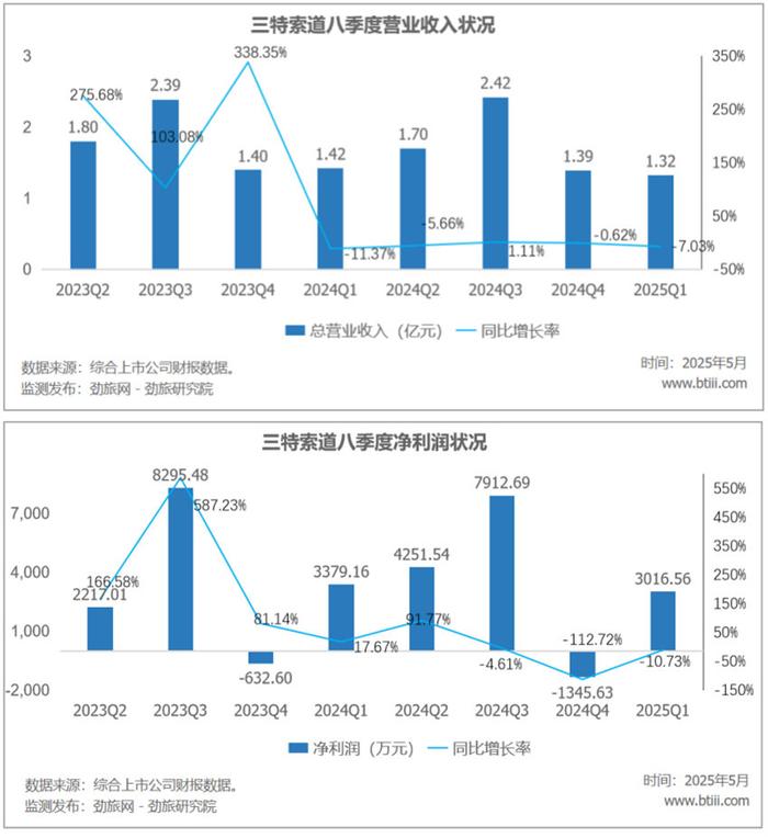 根据报告,一季度三特索道实现营业收入1.32亿元,上年同期为1.42亿元,同比下降7.03%。归属于上市公司股东的净利润3016.56万元,上年同期为3379.16万元,同比下降10.73%。