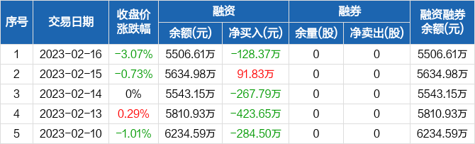 融资方面,当日融资买入592.83万元,融资偿还721.2万元,融资净偿还128.37万元。融券方面,融券卖出0股,融券偿还0股,融券余量0股,融券余额0元。融资融券余额合计5506.61万元。