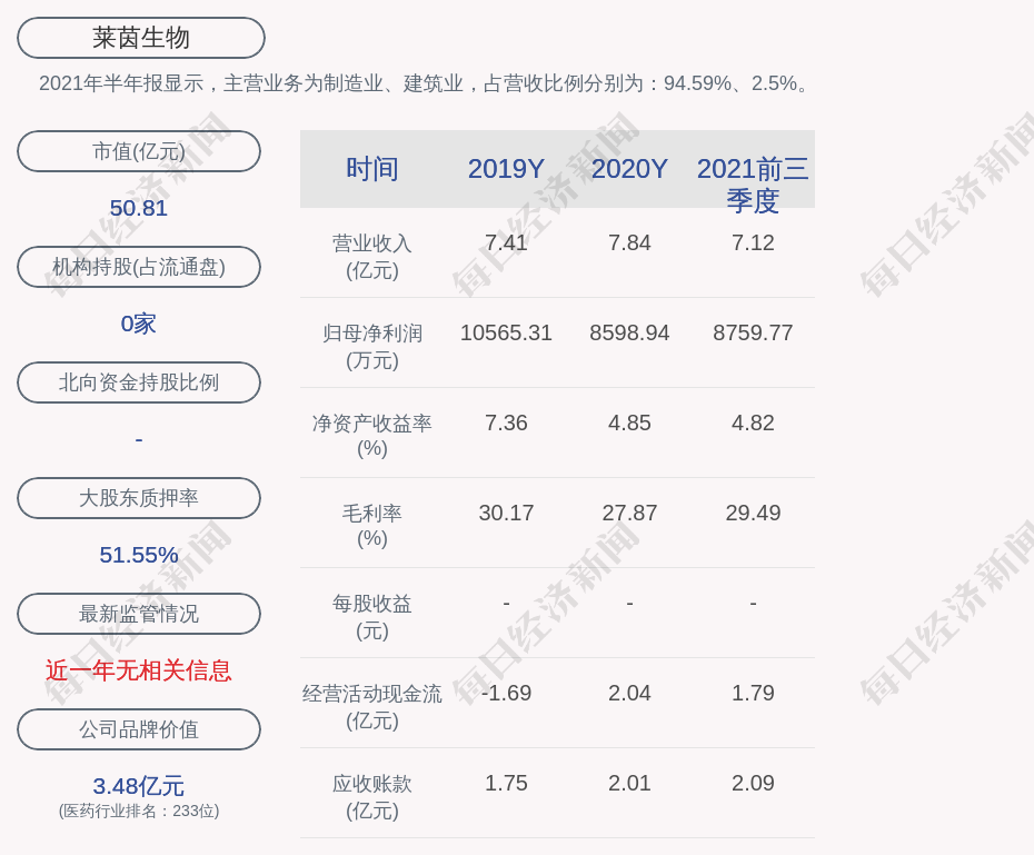2021年半年报显示,莱茵生物的主营业务为制造业、建筑业,占营收比例分别为:94.59%、2.5%。