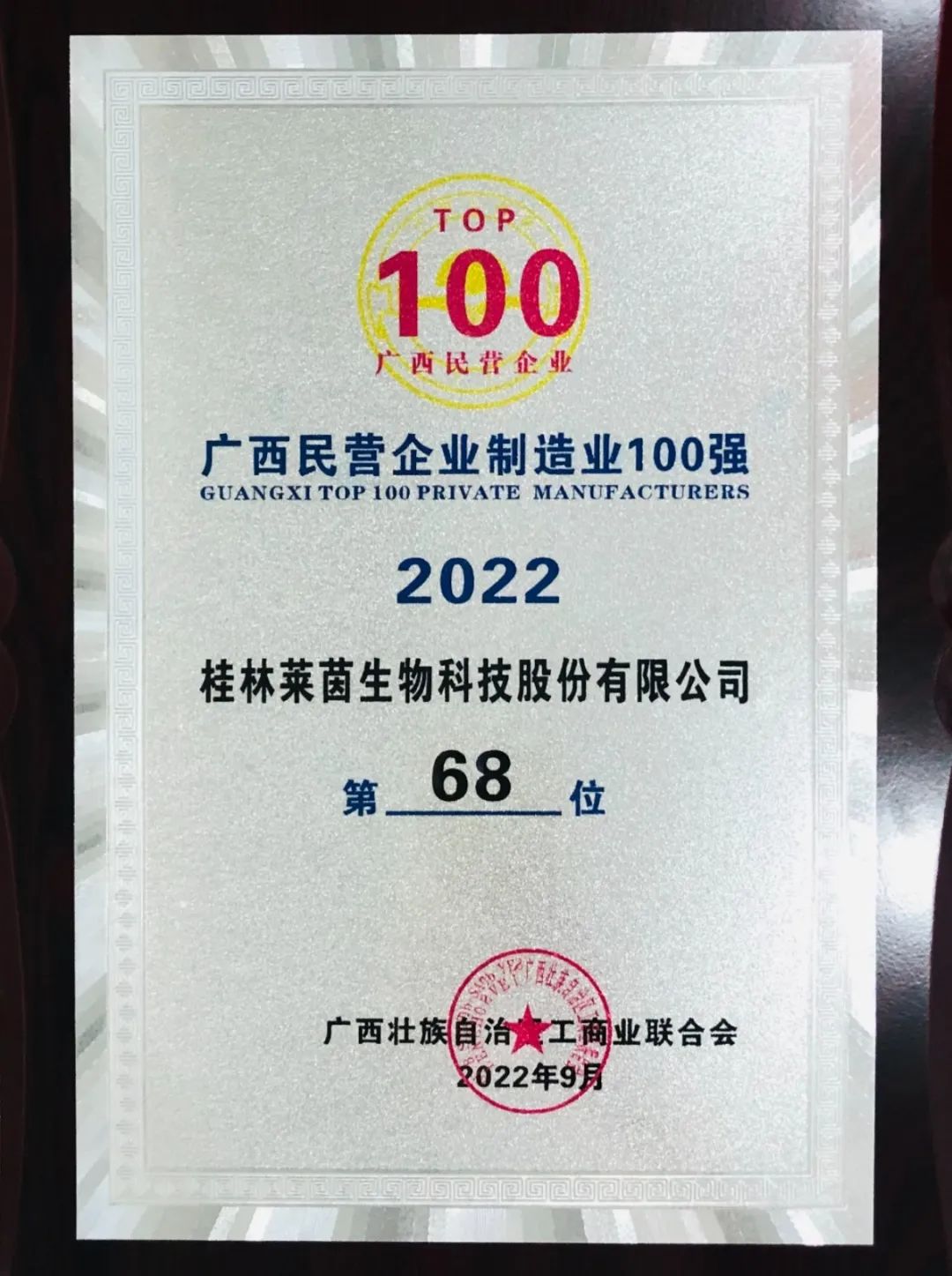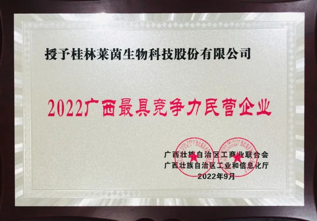 9月6日“2022广西民营企业100强发布会”在柳州市隆重举行。此次发布会由广西壮族自治区工商联、柳州市人民政府主办,相继揭晓了5个榜单。桂林莱茵生物科技股份有限公司位列“2022广西民营企业制造业100强榜单”第68位,列入“2022广西最具竞争力民营企业榜单”,连续多年上榜。据悉,2022年榜单入围门槛大幅提升,同台竞争异常激烈,显现出了优中选优、树立典范的原则,为上榜企业打造品牌度、知名度起到了良好效果。