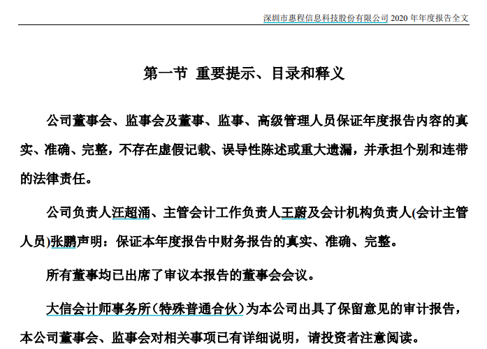 本文摘自重庆惠程信息科技股份有限公司(002168.SZ,惠程科技)于1月31日下午发布的《关于收到中国证监会《行政处罚事先告知书》的公告》。该公司于2022年11月25日收到中国证监会下发的《立案告知书》,近日收到《行政处罚事先告知书》(处罚字〔2024〕3号)。该处罚涉及16人,是近年来处罚人数较多的一次。多人因为“在2020年年报被审计机构出具保留意见的情况下签署书面确认意见”而被罚。财务造假涉及的2019和2020年报,分别由上会会计所和大信会计所审计。