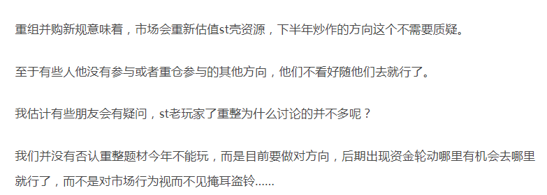 5月16日,中国证监会发布了《关于修改<上市公司重大资产重组管理办法>的决定》,自公布之日起施行。有投资者在互动平台上表示,重组并购新规意味着,市场会重新估值ST壳资源,下半年炒作的方向这个不需要质疑。