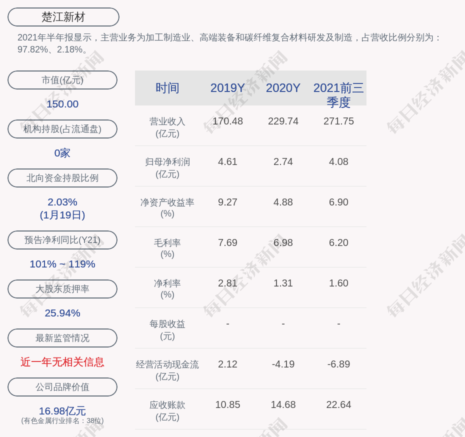2021年半年报显示,楚江新材的主营业务为加工制造业、高端装备和碳纤维复合材料研发及制造,占营收比例分别为:97.82%、2.18%。