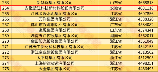 安徽楚江科技新材料股份有限公司入选2024中国民营企业500强榜单,排名264位,较去年提升33位。