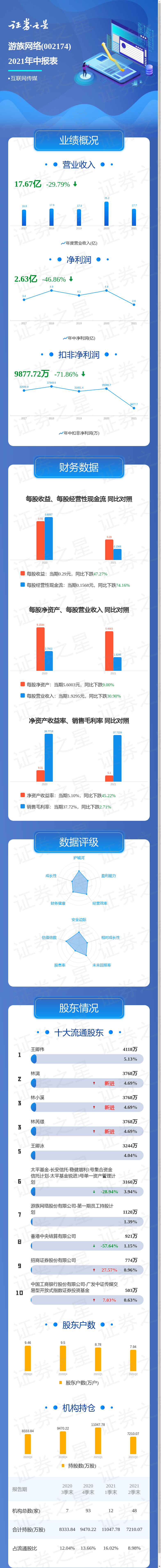 证券之星数据中心讯,游族网络2021中报显示,公司主营收入17.67亿元,同比下降29.79%;归母净利润2.63亿元,同比下降46.86%;扣非净利润9877.72万元,同比下降71.86%;负债率30.68%,投资收益1.06亿元,财务费用98.05万元,毛利率37.72%。