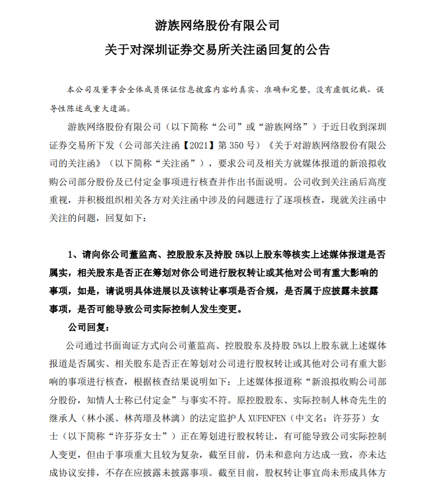 此前10月15日,有媒体报道称,游族网络现任董事长许芬芬已接受新浪集团收购股份的定金,在游族网络体外的新游族大厦也已经被出售。10月18日,深交所对游族网络下发关注函,要求该公司核实“新浪拟收购公司部分股份,知情人士称已付定金”相关报道是否属实,相关股东是否正在筹划对公司进行股权转让或其他对公司有重大影响事项等方面,并说明具体进展以及该转让事项是否合规,是否属于应披露未披露事项,是否可能导致公司实际控制人发生变更。