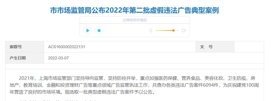 中国经济网北京3月18日讯近日,上海市市场监管局公布2022年第二批虚假违法广告典型案例。2021年,上海市场监管部门坚持导向监管,坚持防控并举,重点加强医药保健、营养食品、美容化妆、卫生防疫、房地产、教育培训、金融和投资理财广告等重点领域广告监管执法工作,共查办各类违法广告案件6094件。