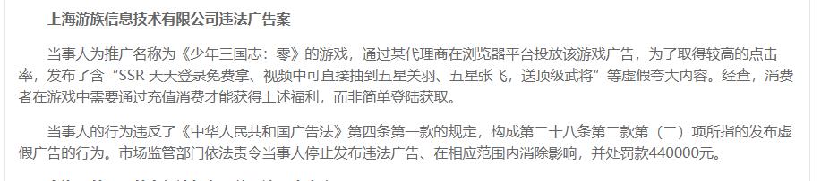 上海游族信息技术有限公司违法广告案显示,当事人为推广名称为《少年三国志:零》的游戏,通过某代理商在浏览器平台投放该游戏广告,为了取得较高的点击率,发布了含“SSR 天天登录免费拿、视频中可直接抽到五星关羽、五星张飞,送顶级武将”等虚假夸大内容。经查,消费者在游戏中需要通过充值消费才能获得上述福利,而非简单登陆获取。