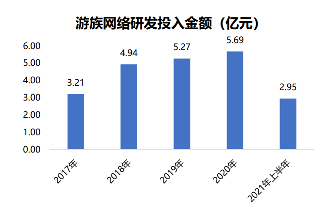 在精品化游戏的竞争环境下,游族网络也更加重视产品自研能力,奉行坚实筑底、突破创新的指导思想,不断强化研发投入。近年来,游族研发投入金额保持逐年增长态势,根据财报数据显示,公司2021年上半年的研发投入金额较去年同期大幅增加70.72%至2.95亿元,前三季度研发费用也同比增长36.75%。