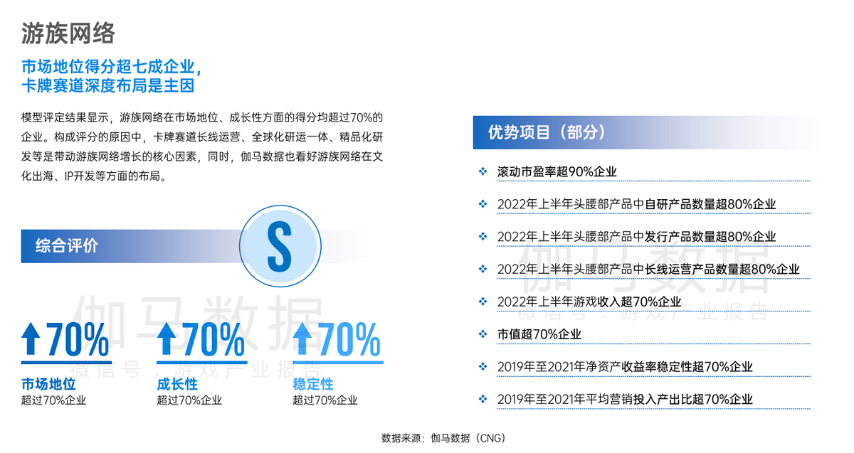 根据《2022年上市游戏企业竞争力报告》统计结果显示,截止2022年6月30日,国内涉及游戏的上市企业数量共197家,贡献的游戏产业市场份额却超过75%,因此现阶段上市游戏企业依然主导产业发展。而在企业竞争力的评估上,伽马数据从市场地位、成长性、稳定性三方面建模,其中市场地位主要衡量现有成果及资源积累,成长性主要衡量预期发展速度,稳定性主要衡量风险抵抗能力。模型评定结果显示,游族网络在市场地位、成长性、稳定性等方面的得分均超过70%的企业。构成评分的原因中,卡牌赛道长线运营、全球化研运一体、精品化研发等是带动游族网络增长的核心因素,同时,伽马数据也看好游族网络在文化出海、IP开发等方面的布局。