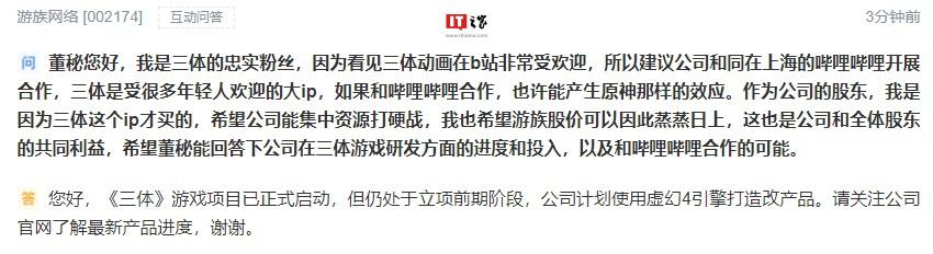 IT之家了解到,游族网络 2021 年 3 月在互动平台表示,《三体》游戏项目已正式启动,但仍处于立项前期阶段,公司计划使用虚幻引擎 4 打造该产品。