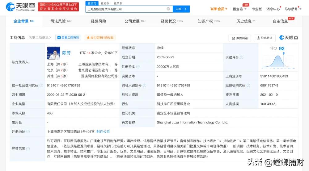 该公司成立于2009年6月,法定代表人陈芳,注册资本2亿人民币,经营范围含互联网信息服务;演出经纪;货物进出口;文艺创作,互联网销售等,由上市公司游族网络股份有限公司全资持股。