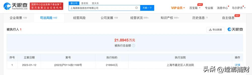 资料显示,1月12日,上海游族信息技术有限公司新增一则被执行人信息,执行标的约21.89万元,执行法院为上海市嘉定区人民法院。