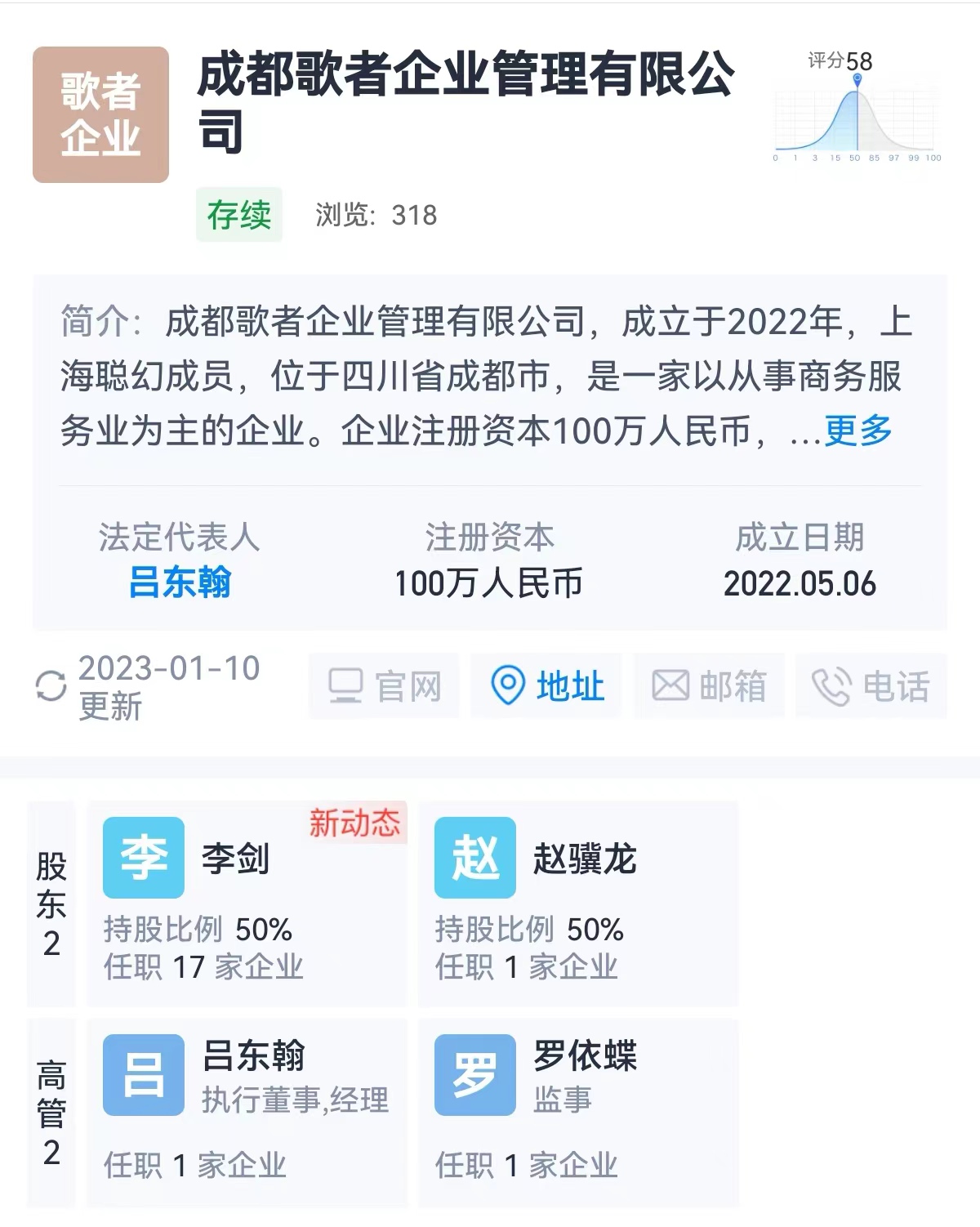资料显示,现任三体宇宙CEO赵骥龙为成都歌者股东之一,持股比例50%。