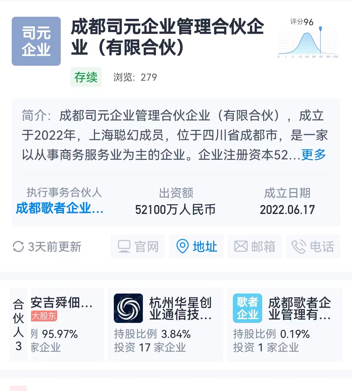 记者查询天眼查APP显示,目前成都司元大股东为安吉舜佃股权投资合伙企业(有限合伙),持股比例95.97%,其次为杭州华星创业通信技术股份有限公司,持股比例3.84%,第三大股东为成都歌者企业管理有限公司,持股比例0.19%。