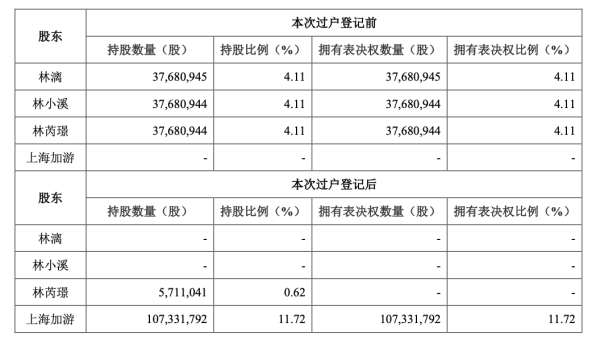3月15日,公司原控股股东、实际控制人林奇的继承人林小溪、林芮璟、林漓及其法定监护人许芬芬,通过协议转让方式转给上海加游1.07亿股股份(占目前公司总股本11.72%)完成过户登记手续。此外,自目标股份交割日起18个月,转让方及转让方代表自愿且不可撤销地放弃截至目标股份交割日所持有的上市公司571万股股份(占目标股份交割日上市公司总股本约0.62%)对应的表决权。