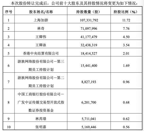 根据游族网络出具的《确认函》,本次股份转让完成后,公司前五大股东分别为上海加游、林奇、王卿伟、王卿泳、香港中央结算有限公司。
