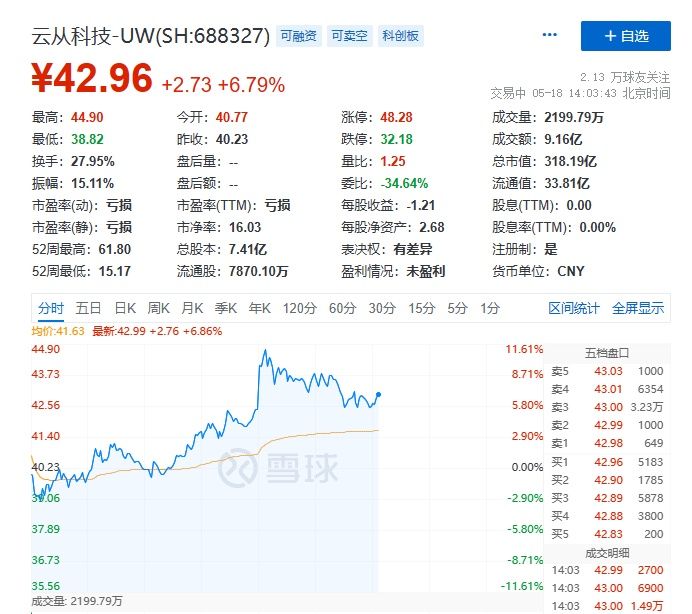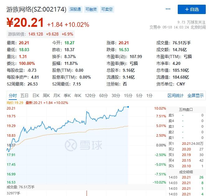 受该合作消息利好影响,截至5月18日14时左右,游族网络涨停,报20.21元;云从科技涨6.79%,报42.96元。