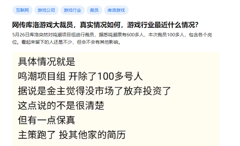 今年毕业季期间,除了游族网络之外,同样被曝出毁约校招生的还有库洛游戏。5月末,网络信息显示因库洛鸣潮项目被缩减,大约百余人被裁员,其中也包含不少校招生。