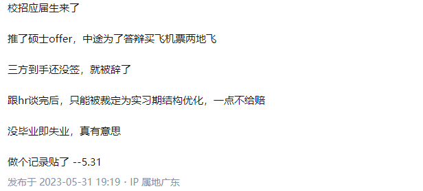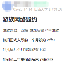 据文章显示,游族集体解约事件发生于5月下旬。某招聘平台的帖子同样印证了该消息,5月23日,一名计算机专业的应届生原本将于毕业后入职游戏后端,却在入职前一个月被毁约。评论区也是苦命人相聚,一片“哀声载道”。