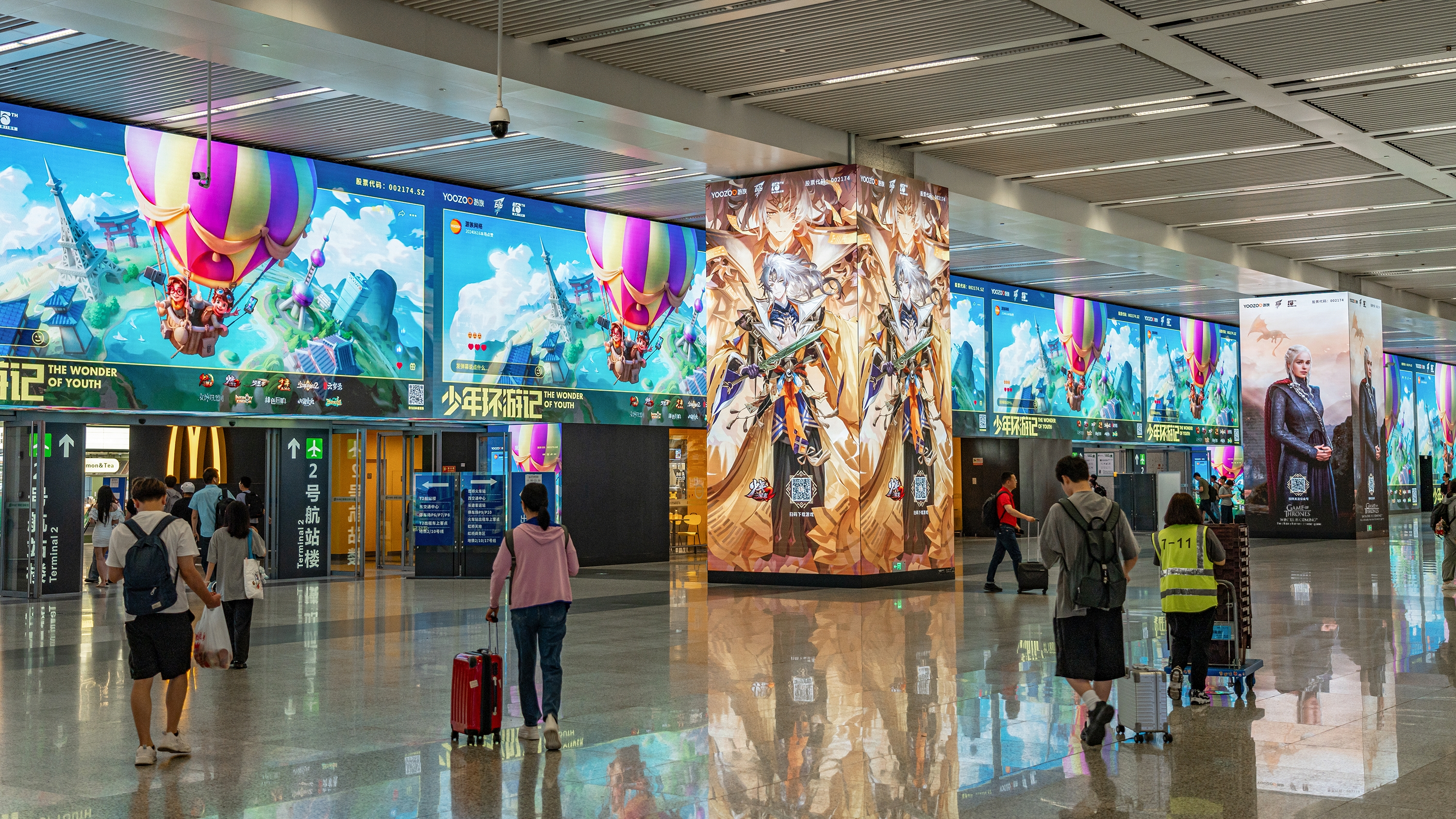 为贴合本次活动主题“少年环游记”,游族还首次在上海虹桥航站楼进行了沉浸式线下营销,活动海报及各大游戏角色立柱震撼呈现,从上海出发,开启环球福利游。
