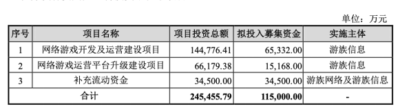 按照之前的规划,总募集的资金中,6.53亿元将投入“网络游戏开发及运营建设项目”,1.51亿元将投入“网络游戏运营平台升级建设项目”,剩余约3.45亿元将用于补充流动资金。