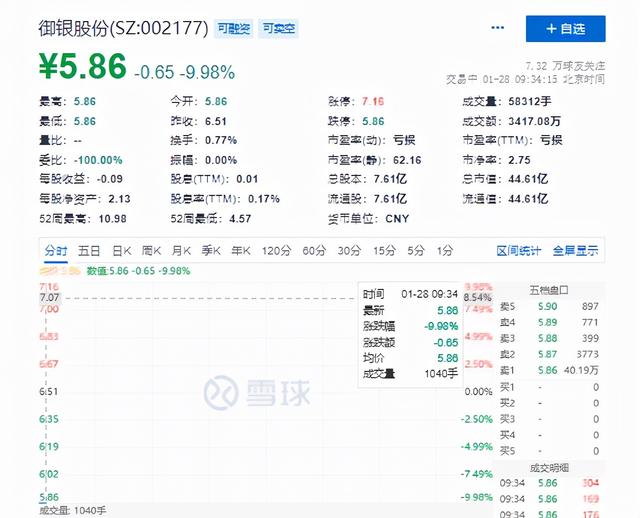 1月28日,数字货币概念股御银股份开盘跌停。截至发稿,报5.86元/股,换手率0.77%,成交额3417.08万元。