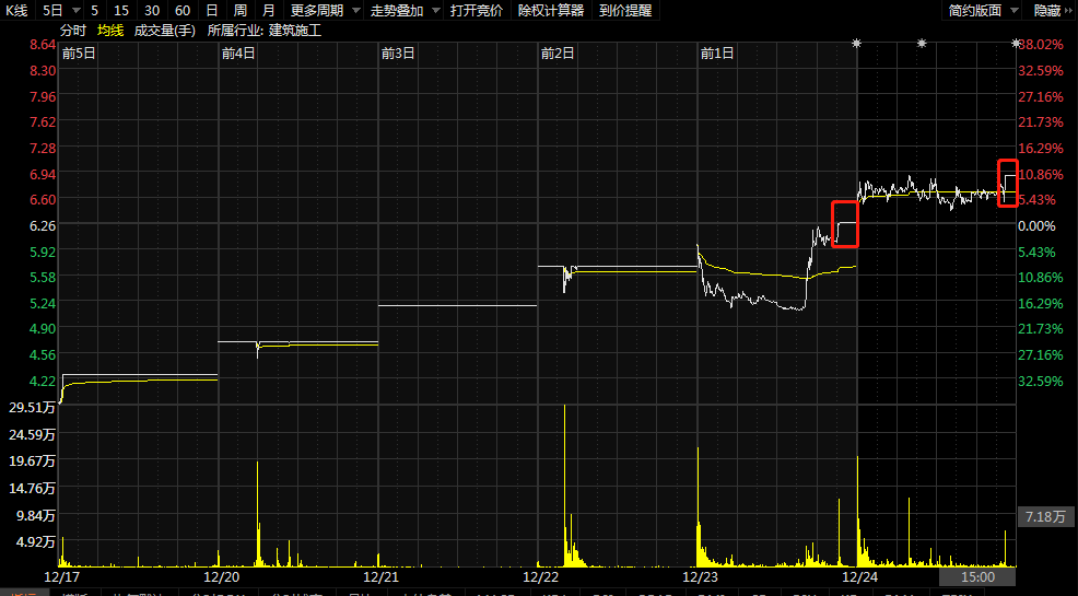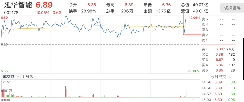 12月24日,延华智能以6.36元/股高位开盘,其后股价持续拉升,到下午14时43分左右终于拉升至6.89元/股并触及涨停板,最终该股票以10.06%涨停收盘。