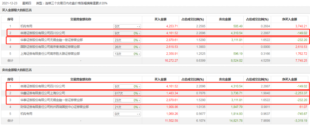 从龙虎榜来看,12月21日至23日三个交易日内,申港证券股份有限公司四川分公司以4161.52万元位居延华智能买入榜的第二名,同时以4310.54万元处于该公司卖出榜的第一名;华泰证券无锡金融一街证券营业部也是如此,其以2879.61万元局买入榜的第三名,但同时以3111.81万元处于卖出榜的第三名。