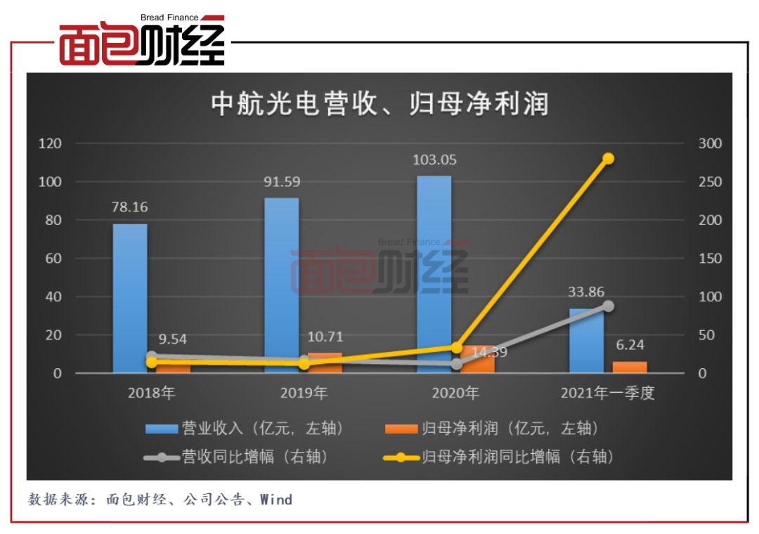 2020全年及2021年一季度,中航光电业绩增势较明显。2020年公司营收和归母净利润分别为103.05亿元和14.39亿元,同比分别增长12.52%和34.36%。受较低基数影响,2021年一季度公司营收和归母净利润分别为33.86亿元和6.24亿元,同比分别增长88.14%和281.43%。
