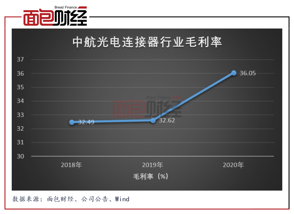 此外,中航光电连接器行业的毛利率同比上升,主要系原材料成本增幅小于营收增幅。2020年,公司连接器行业的毛利率同比上升3.43个百分点,增幅较大。研究发现,当期占逾七成营业成本的原材料成本为47.64亿元,同比增幅为5.26%,远低于该行业营收的同比增幅12.64%。