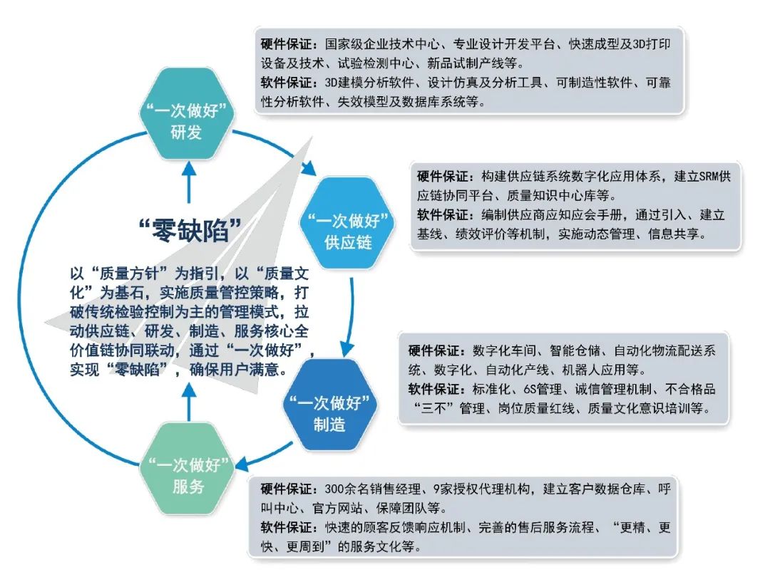 该模式以“质量第一、连接可靠、一次做好、顾客满意”的质量方针为指引,以“质量是责任、良心、人品”的质量文化为基石,按照“技术保障、流程优化、系统培训、僵化执行、首长问责、规范有序”的质量管控策略,拉动供应链、研发、制造、服务核心全价值链协同联动,通过“一次做好”,实现“零缺陷”,确保用户满意。