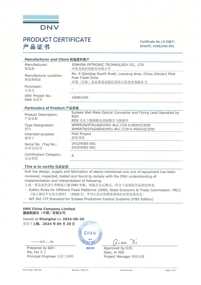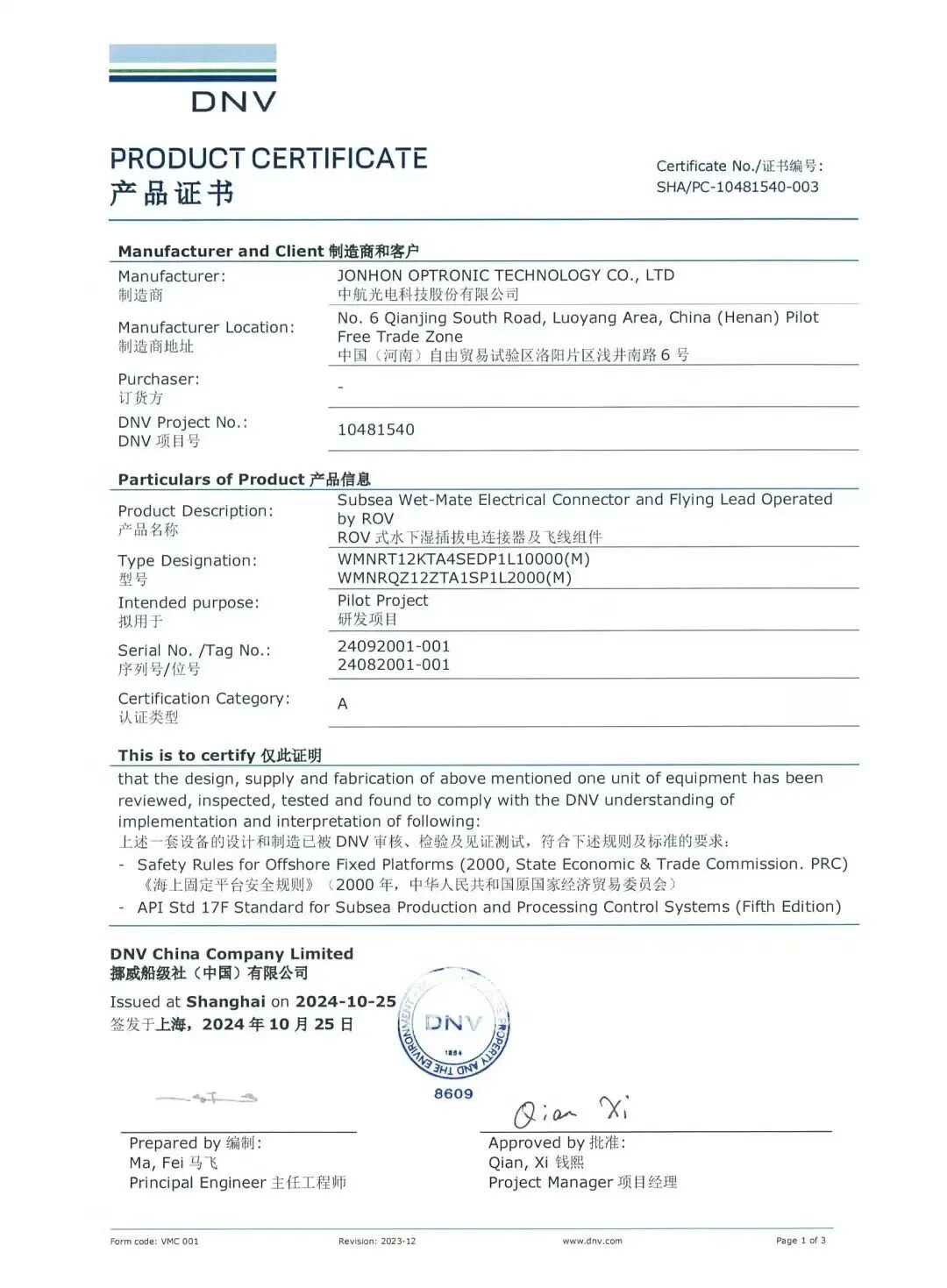 12月24日,中航光电自主研发的压力平衡式水下湿插拔光电混装连接器成功通过挪威船级社(DNV)认证,成为国内首例通过该权威认证的压力平衡式水下湿插拔光电混装连接器产品。此次通过认证标志着中航光电在高端水下连接器领域迈出关键的一步。继2024年湿插拔电连接器和湿插拔光纤连接器通过DNV认证后,中航光电成为国内首家集纯光、纯电、光电混合三类水下湿插拔产品全部获得DNV认证的水下互连产品供应商,彰显了中航光电在水下互连领域的深厚技术实力。